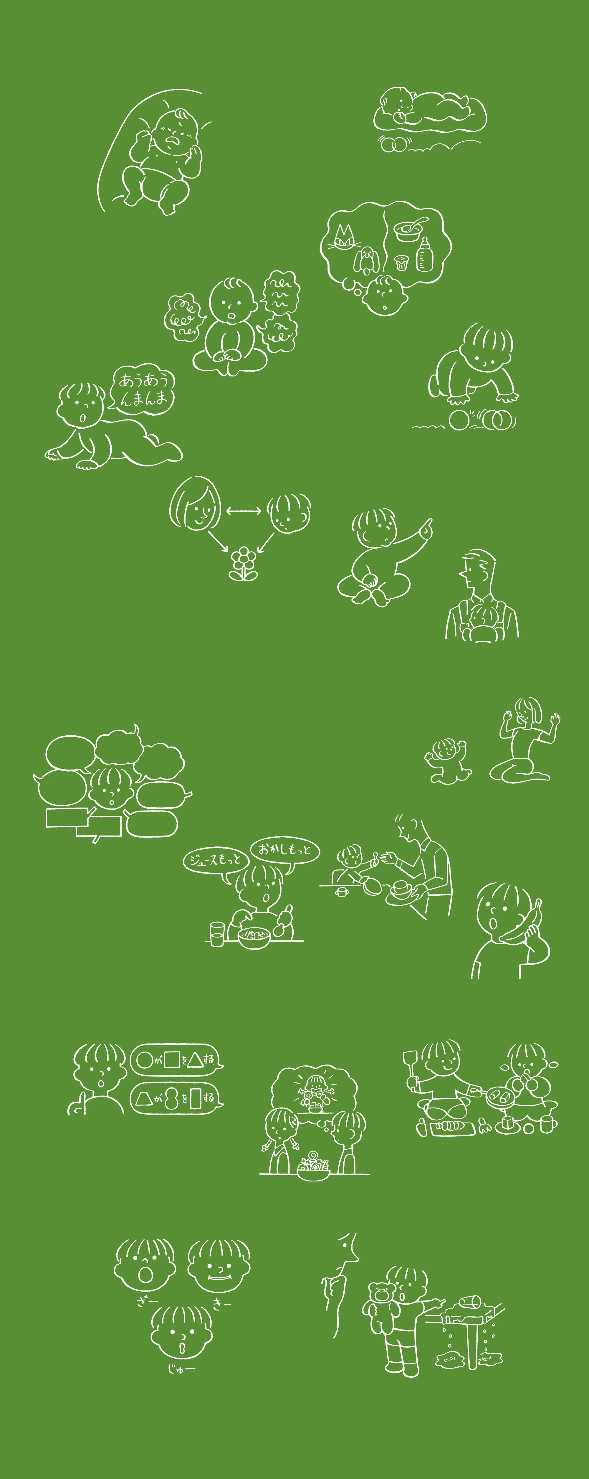 赤ちゃんが出会う世界では、様々な社会的やりとりが繰り広げられています。自分にはたらきかけてくる人もいれば、近くで話し合ったり、スマホや本に見入っている人もいます。また、食事や睡眠、遊びなどの活動を、毎日他者と行います。このような環境の中での学習を土台としてコトバが使えるようになっていきます。