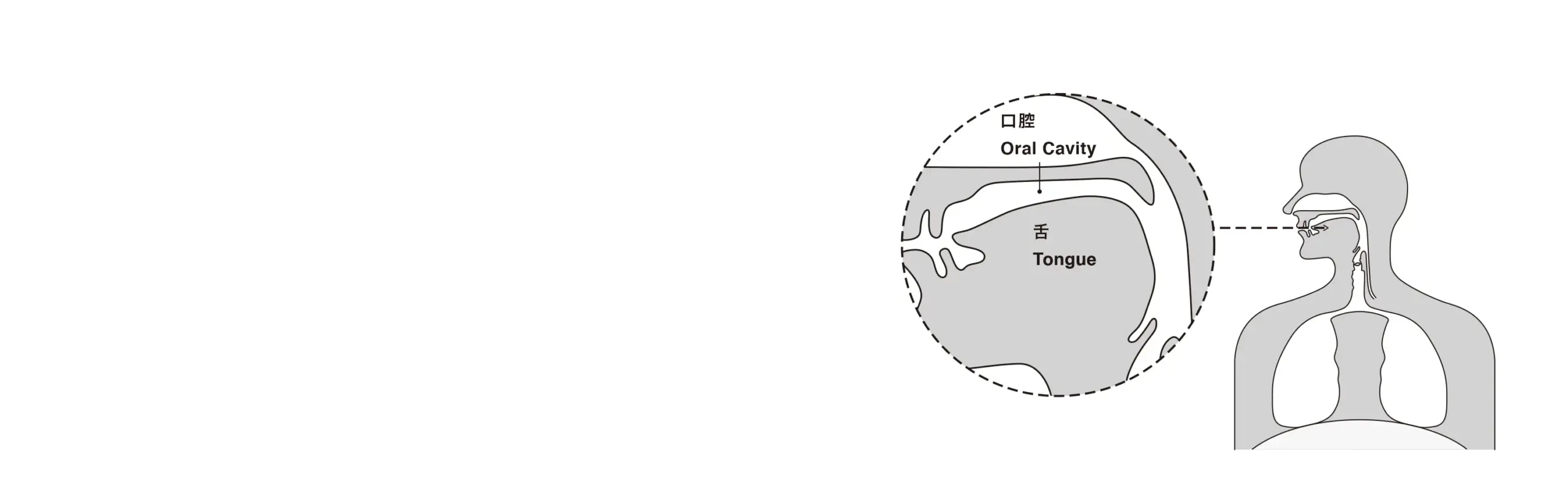 舌は音声言語における最も重要な器官のひとつで、細かなコントロールをして音を調整します。舌先を前後左右に動かしたり、部分的に厚みを変えることで、母音や子音を生成します。このような動きは7種類の舌筋線維走行が複雑に組み合わさることで可能になっています。