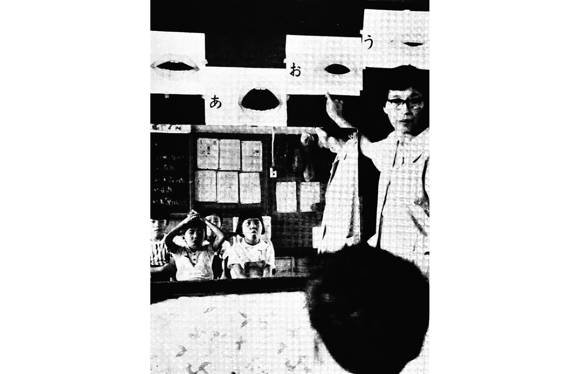 A scene from a school for the deaf during the era of oral language education. The students practiced to stabilize the position of the tongue by imitating the shape of the mouth while looking in the mirror.