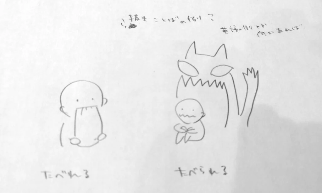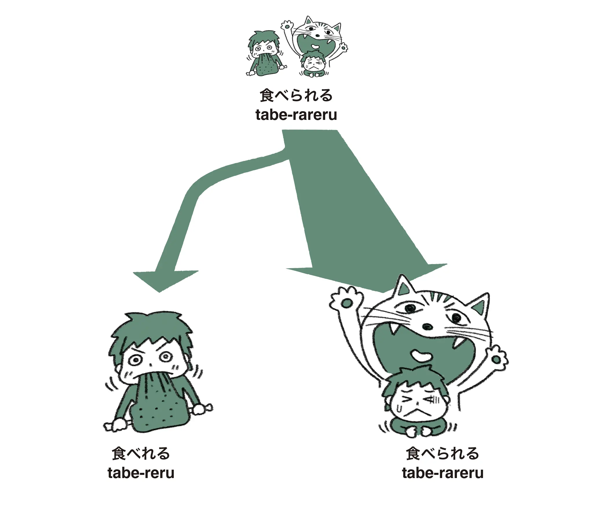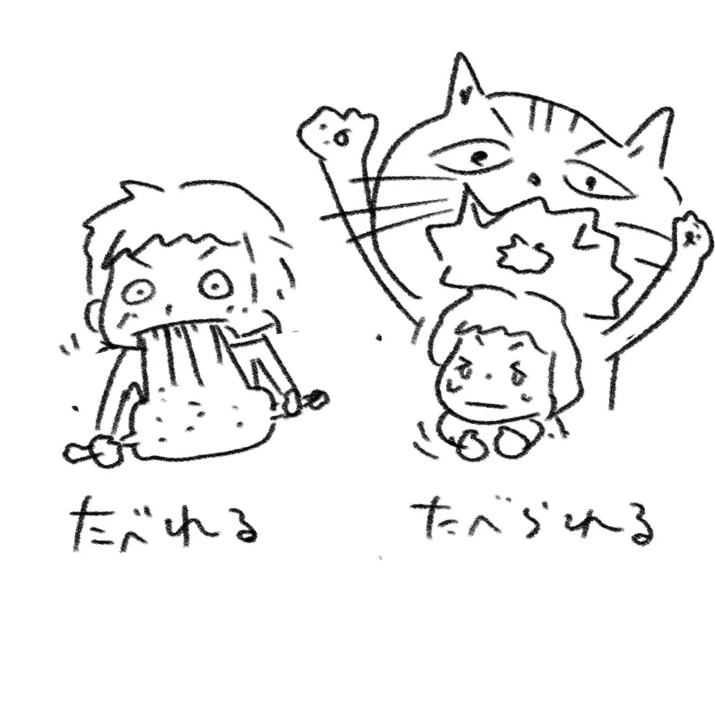 例として「たべられる」を使用。元は2つの意味を持つ「たべられる」→「たべれる」と「たべられる」に分化。