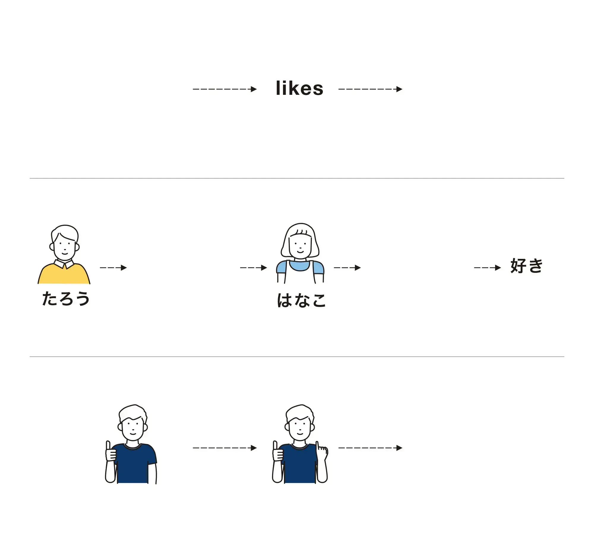 • 意味と結びついたたくさんの形。この「語」の並べ方の規則に従うと文ができ、複雑な意味を伝えることができるようになります。たとえば、男の子と女の子、どちらかがどちらかに片想い。「している人」と「されている人」を表現する規則も、言語によって異なります。