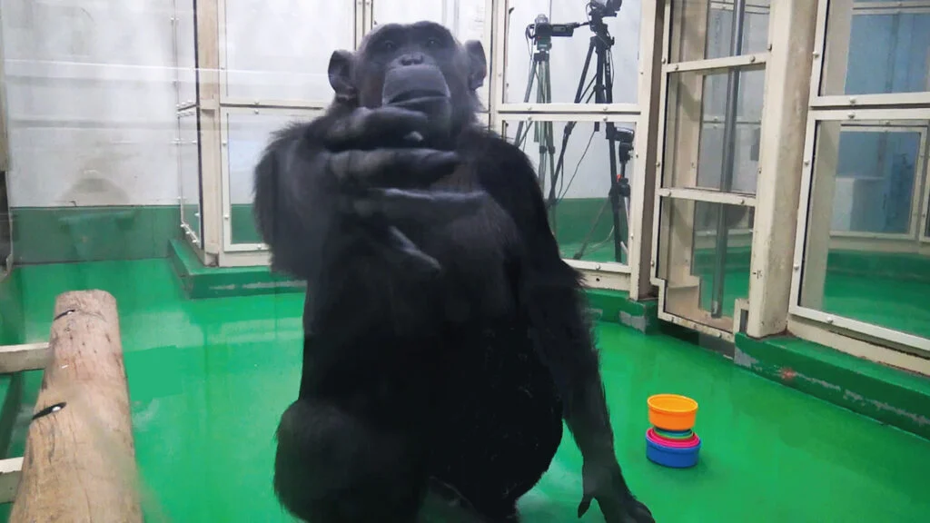A chimpanzee, Cleo, demands to end a task of combining nesting-cups after she failed to achieve the full seriation (taken at Primate Research Institute, Kyoto University)
