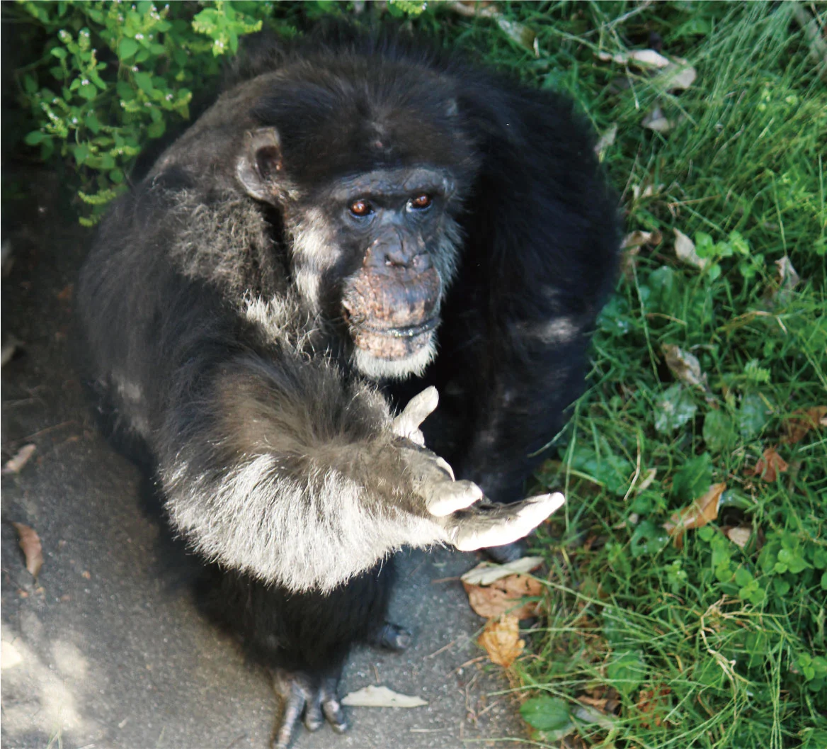 A chimpanzee, Akira, begging for a food item by whole-hand pointing towards a human distributing foods as enrichment (taken at Primate Research Institute, Kyoto University)